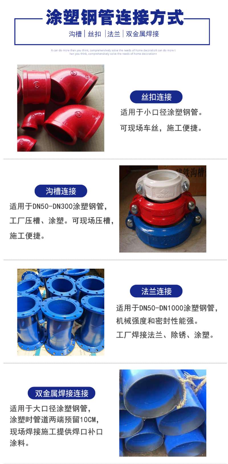 承插連接,又稱擴(kuò)口連接。是通過改變管道連接件的密封連接結(jié)構(gòu),使其從根本上解決管道連接中的滲水難題,擴(kuò)口連接保證了管連接件與涂塑鋼管的密封連接性。施工操作簡單方便,主要用于穿線管路使用。